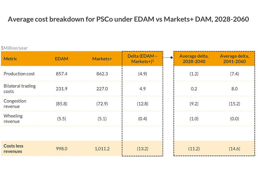 The study, conducted by Aurora Energy Research, found EDAM could provide the Denver-based utility $11.2 million more in average annual savings from 2028 to 2040 compared with Markets+, rising to $13.2 million through 2060.