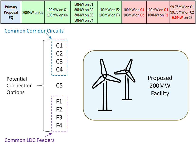 Proposals to IESO's LT2 procurement may specify connection to up to four circuits/feeders within a common corridor (green boxes) but cannot mix circuits and feeders or circuits in separate corridors (red boxes). | IESO