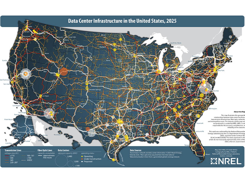 A National Renewable Energy Laboratory map shows data centers and supporting infrastructure circa 2025. | NREL