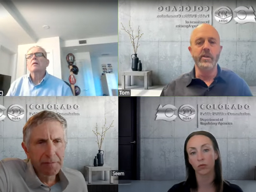 Colorado PUC Chair Eric Blank, bottom left, and commissioners Tom Plant and Megan Gilman are joined by commission advisor Gerald Deaver, top left, during the commission’s July 23 meeting. | Colorado PUC