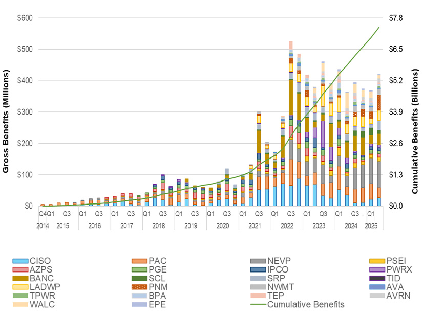 CAISO’s Western Energy Imbalance Market provided participants with $422.44 million in economic benefits during the second quarter of 2025, up 15% compared with the same period year earlier despite no change in membership.