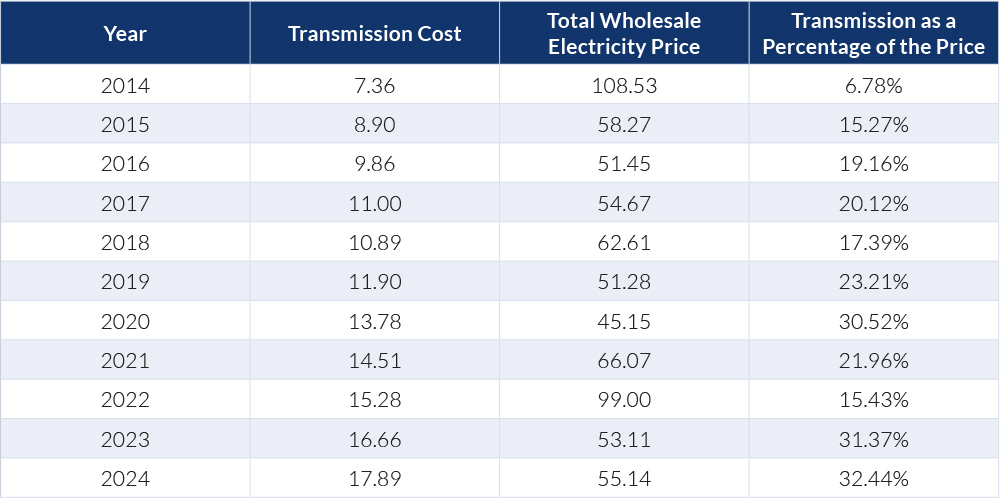 PJM, the largest RTO in the country, is a cautionary tale. In 2014, transmission charges were 6.8% of the PJM wholesale price. A decade later, they are over 32%, even though demand has barely moved.