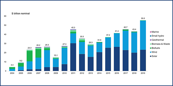 U.S. renewable investments jumped 28% to $55.5 billion in 2019, showing clean energy is thriving despite the government’s failure to enact climate policies.