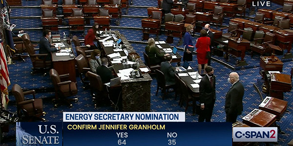 Former Michigan Gov. Jennifer Granholm was sworn in as the 16th secretary of energy on Thursday after the Senate confirmed her nomination, 64-35.