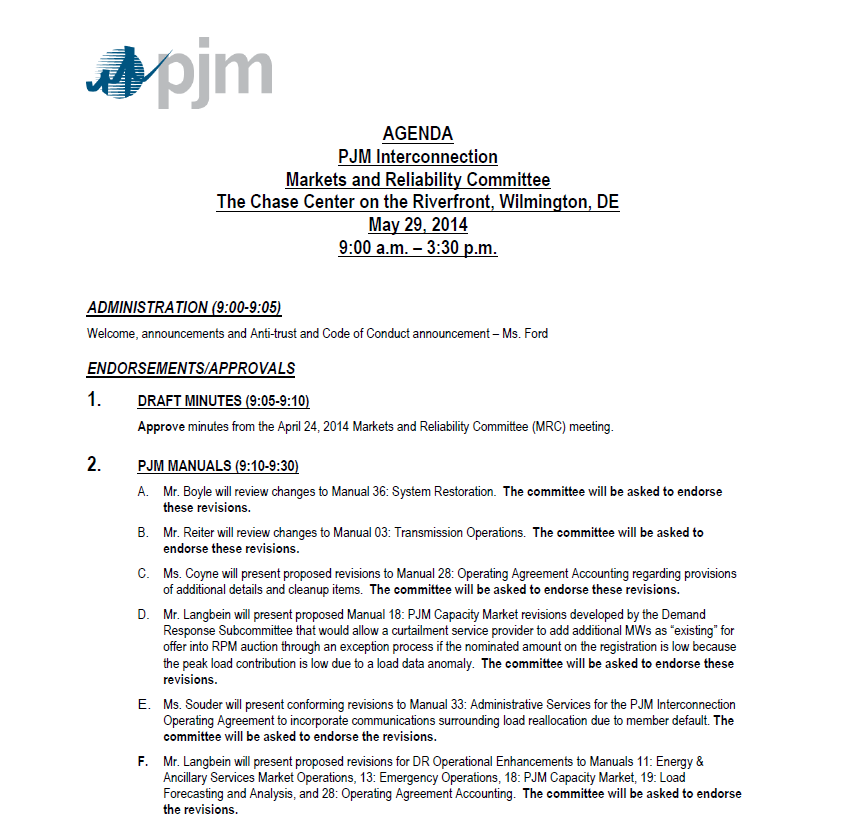 Our summary of the issues scheduled for votes at the PJM MRC on 05/29/14. Each item is listed by agenda number, description and projected time of discussion, followed by a summary of the issue and links to prior coverage.