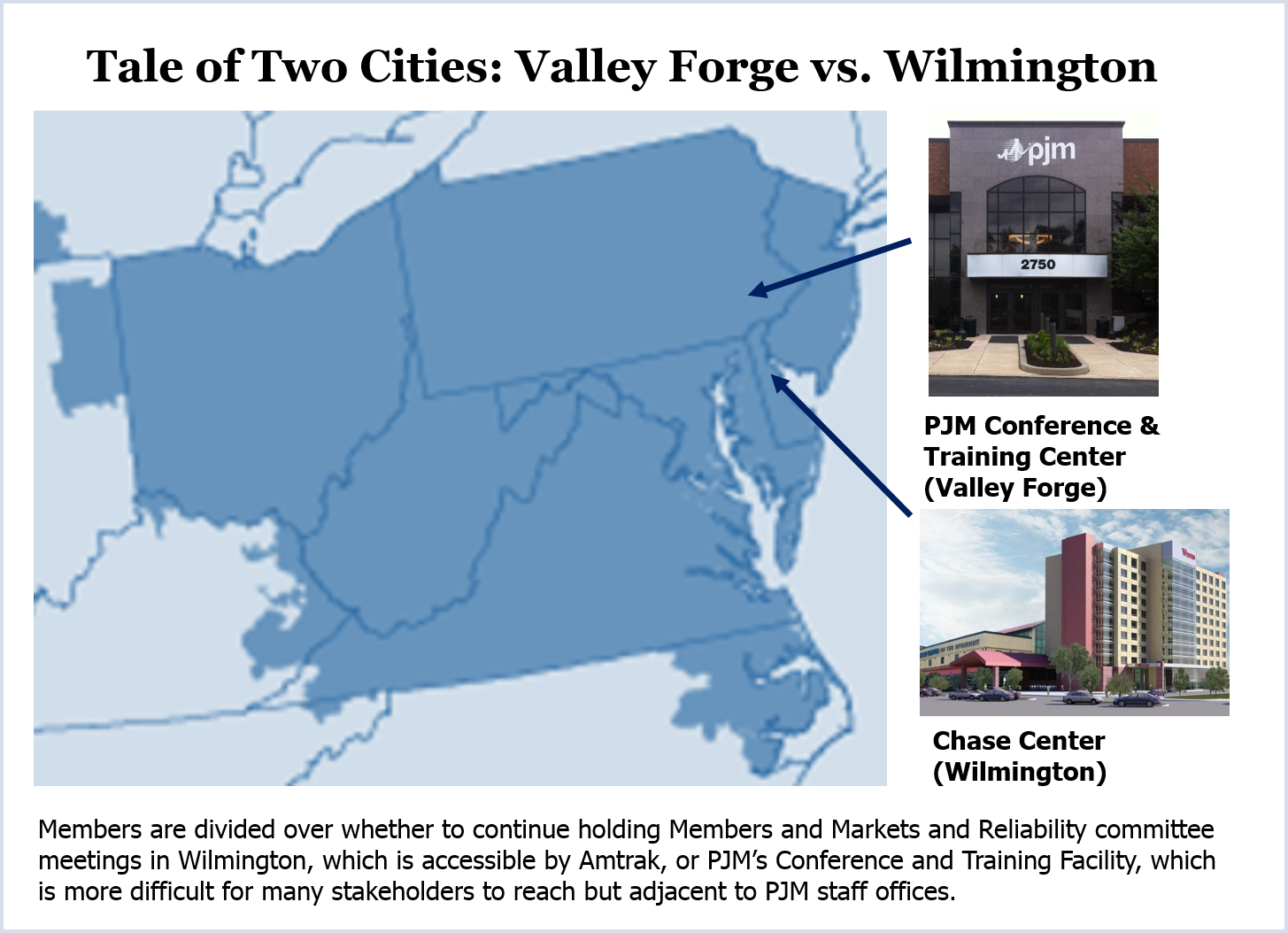 Though a bridge to Wilmington has finally reopened, some PJM members want to continue holding MRC and MC meetings at the RTO's Conference and Training Center in Valley Forge.