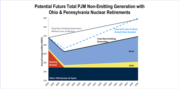 The closure of four nuclear plants in Pennsylvania and Ohio would boost power prices and carbon emissions, undoing the clean air benefits of renewables, according to a Brattle Group report.