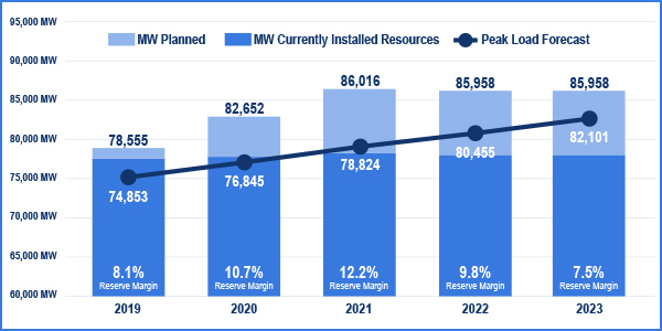 ERCOT said Tuesday that it confronts a historically low 8.1% planning reserve margin next summer in the face of continued high electricity demand from oil and gas producers in West Texas and the cancellation of several generation projects.