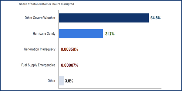“Between 2012 and 2016, there were roughly 3.4 billion customer-hours impacted by major electricity disruptions. Of that, 2,382 hours, or 0.00007% of the total, was due to fuel supply problems (Figure 1). Interestingly, 2,333 of those customer hours were due to one event in Northern Minnesota in 2014. And it involved a coal-fired power plant.”