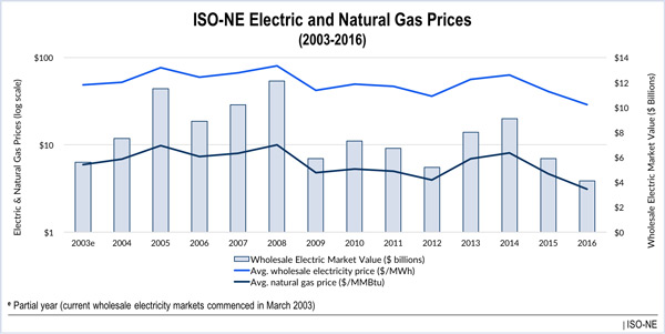 ISO-NE’s wholesale electric market totaled $4.1 billion in 2016, down 30% from 2015 thanks to low natural gas prices and mild weather.