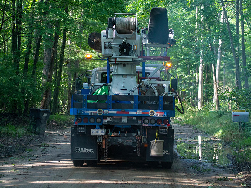 A Consumers Energy lineman truck rolls through an area of Michigan that had lost power during the storms of Aug. 10-11 | Consumers Energy
