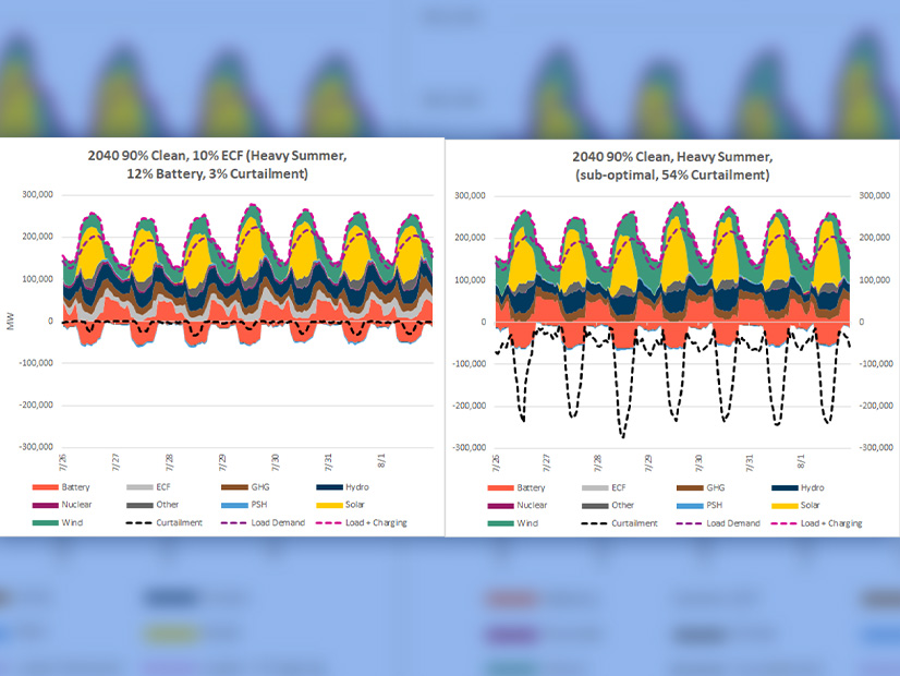 In a 90% clean-energy scenario, high curtailments occur (right) unless new emerging clean and flexible (ECF) resources replace gas plants. | WECC