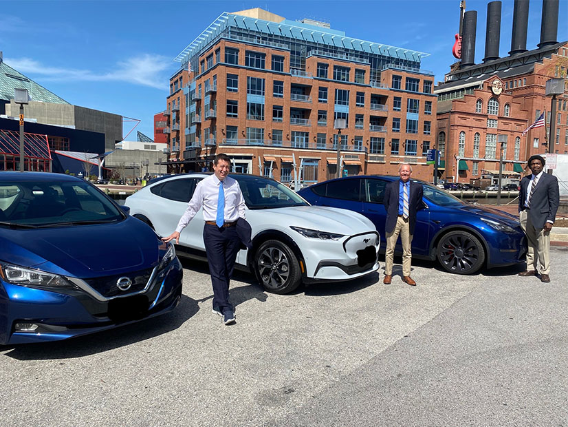 Three of five Maryland Public Service commissioners now drive EVs: (from left) Chair Jason Stanek (Nissan Leaf); Commissioner Michael Richard (Ford Mustang Mach-E) and Commissioner Obi Linton (Tesla). | Maryland Public Service Commission