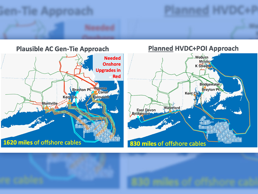 A 2020 study from the Brattle Group compared unplanned (left) and planned transmission for offshore wind in New England. | The Brattle Group