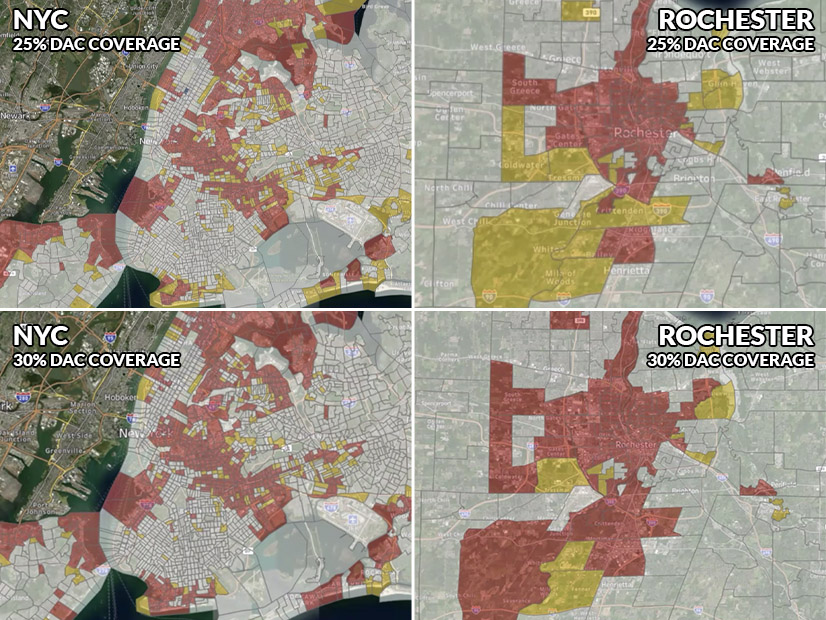 Rochester and New York City with 25% DAC coverage (top row) and 30% coverage (bottom row); red indicates census tracts covered and yellow shows tracts lost in a lower threshold. | CJWG