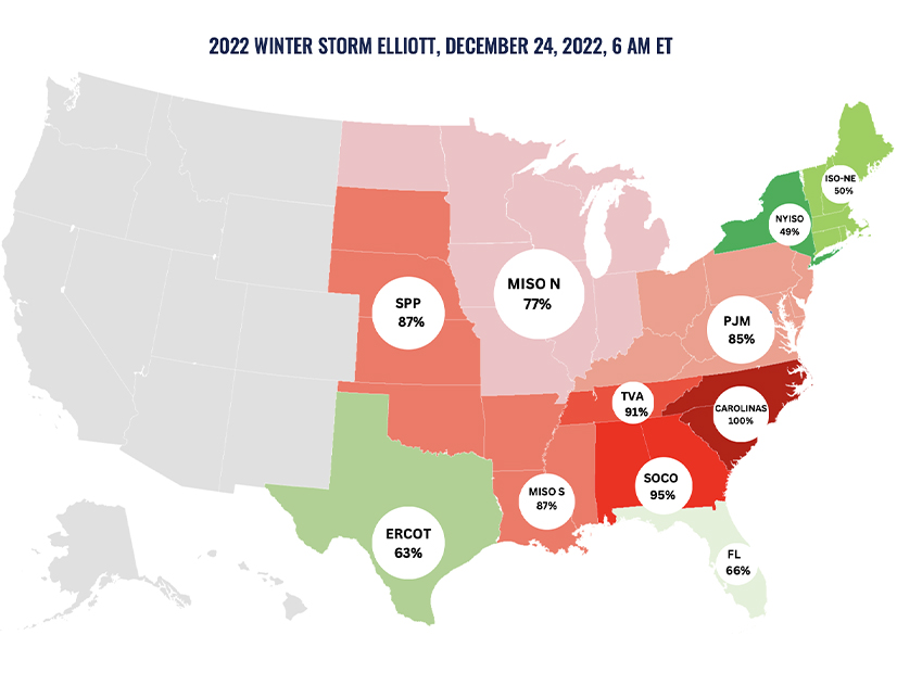 A map produced by Grid Strategies for Americans for a Clean Energy Grid showing net load (demand minus renewable output plus forced outages) of the Eastern Interconnection and ERCOT during one hour of December's winter storms. Regions near 100% and in red are experiencing maximum shortfalls, while green ones have plenty of spare capacity. | Grid Strategies