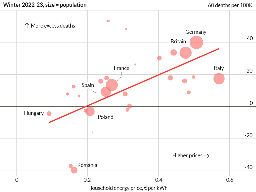 The Economist analyzed “excess deaths” in Europe last winter that are attributable to the enormous increase in residential energy prices after Russian President Vladimir Putin weaponized natural gas supply. Its chart shows the correlation between higher energy prices and higher excess deaths.