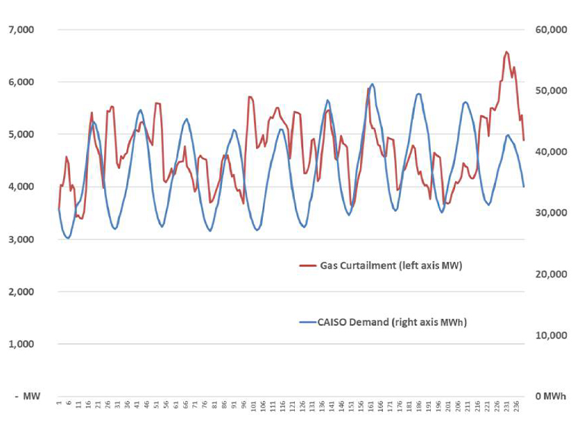 Graph shows CAISO's total gas plant curtailments by hour versus hourly demand. | Regenerate California