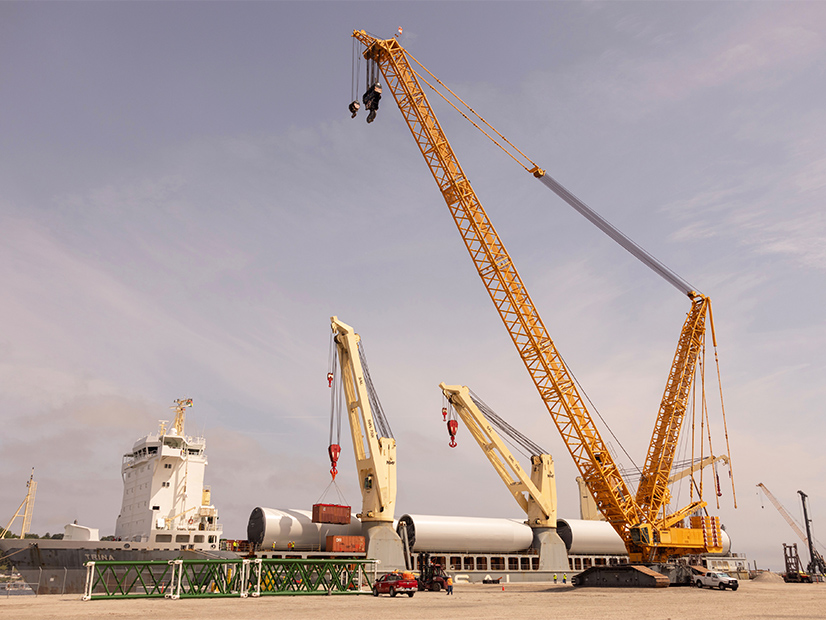 Construction crews work on the first South Fork Wind tower sections in New London, Ct., earlier this month. | South Fork Wind