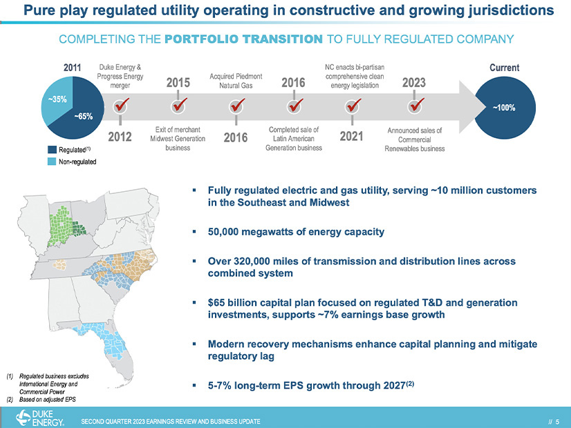 A slide Duke Energy produced showing major developments in its business to a fully regulated firm focused on the energy transition. | Duke Energy