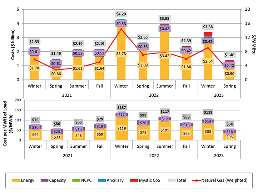 New England wholesale market costs were significantly lower in the spring of 2023 compared to spring 2022 and 2021, the ISO-NE Internal Market Monitor told the Markets Committee.