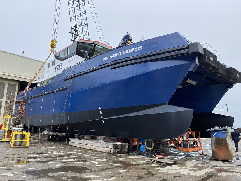 The offshore wind crew transfer vessel Windserve Genesis is shown prior to launch last month at Senesco Marine in Rhode Island. | Revolution Wind
