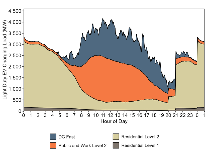 Projected statewide power sources for light-duty vehicle charging for 7.1 million zero-emission vehicles on a typical 2030 weekday. | CEC and NREL