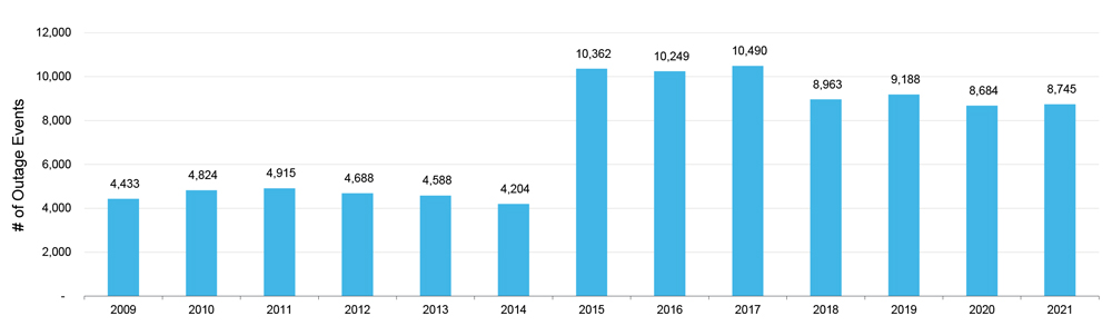 This is not valid analysis. Starting in 2015, NERC expanded the facilities subject to reporting from 200 kV and above, to 100 kV and above.[2] The number of facilities (elements) subject to reporting increased from 7,098 to 23,835, and the number of subject circuit miles increased from 181,427 to 454,316.[3] So the increase in reported outages has everything to do with a larger number of subject facilities and circuit miles, and nothing to do with transmission system reliability.
