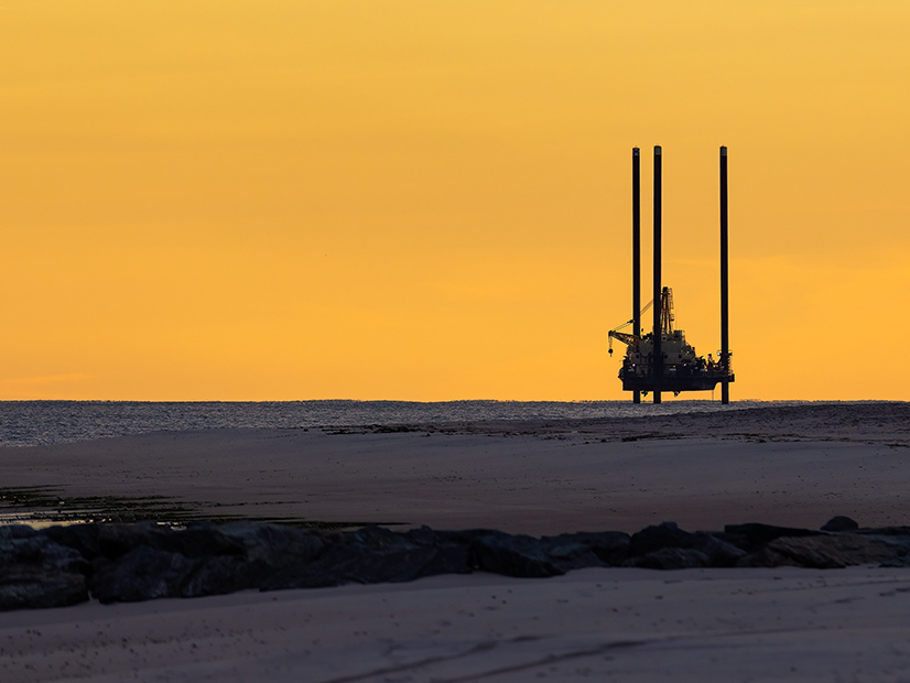 A jack-up barge is shown during geotechnical survey work off the New York coast in preparation for offshore wind power development. | Shutterstock