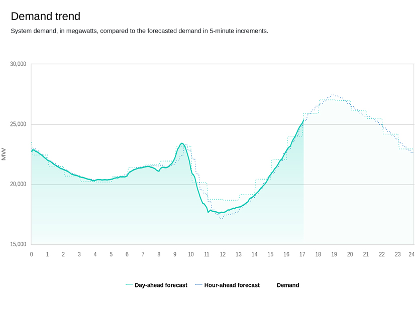 Graph shows CAISO's net demand increasing sharply around 9:30 a.m. on Oct. 14 as solar rolled off the system because of the eclipse. | CAISO