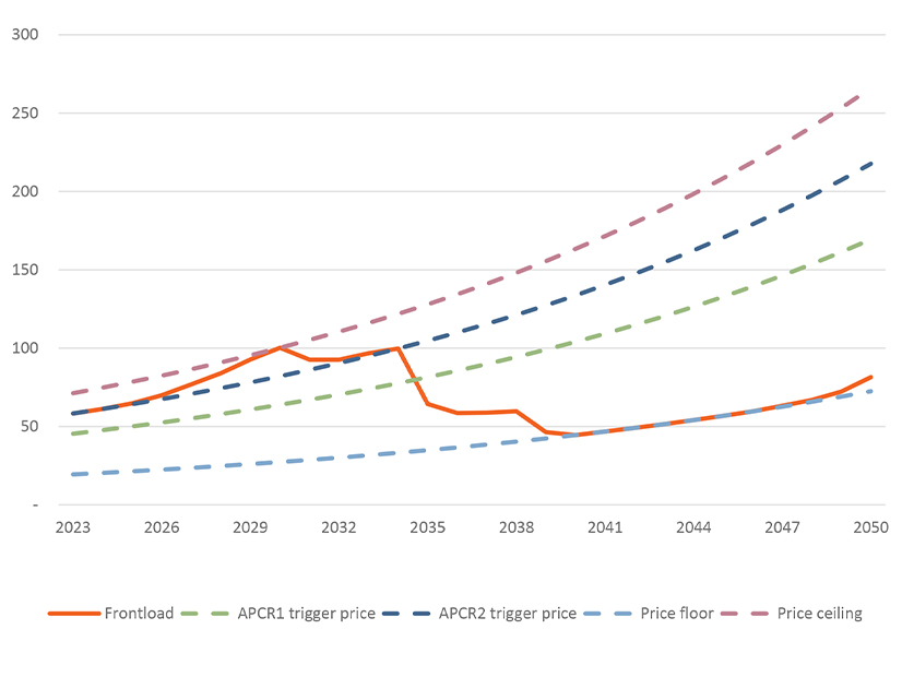 Projected Washington allowance prices in a standalone carbon market. Prices are predicted to rise in the early years of the program and reach the price ceiling in 2030, then level off, followed by declines. Linkage with California-Quebec is expected to mitigate the initial rise. | Washington Dept. of Ecology