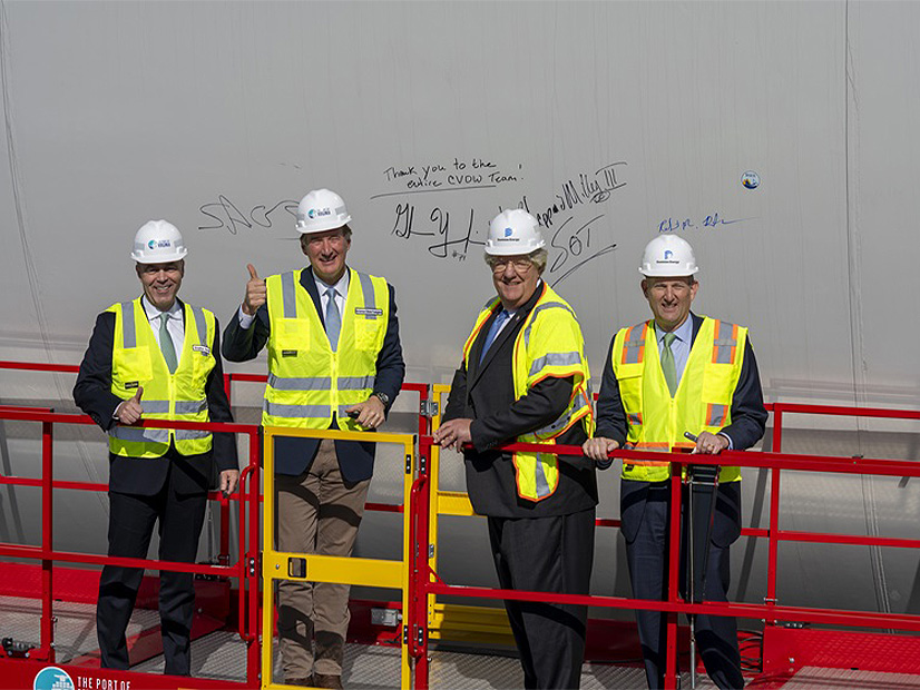 Port of Virginia CEO Stephen Edwards, Gov. Glenn Youngkin (R), Virginia Secretary of Transportation Shep Miller, and Dominion Energy CEO Robert Blue at a ceremony celebrating the first delivery of monopiles to the utility's offshore wind project. | Dominion Energy