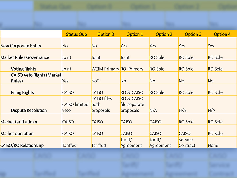 The group working to establish a single Western RTO heard summaries of five potential options for a new governing body that could be independent of CAISO.