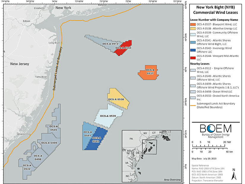 A U.S. Bureau of Ocean Energy Management map shows wind energy lease areas off the New Jersey coast. | BOEM