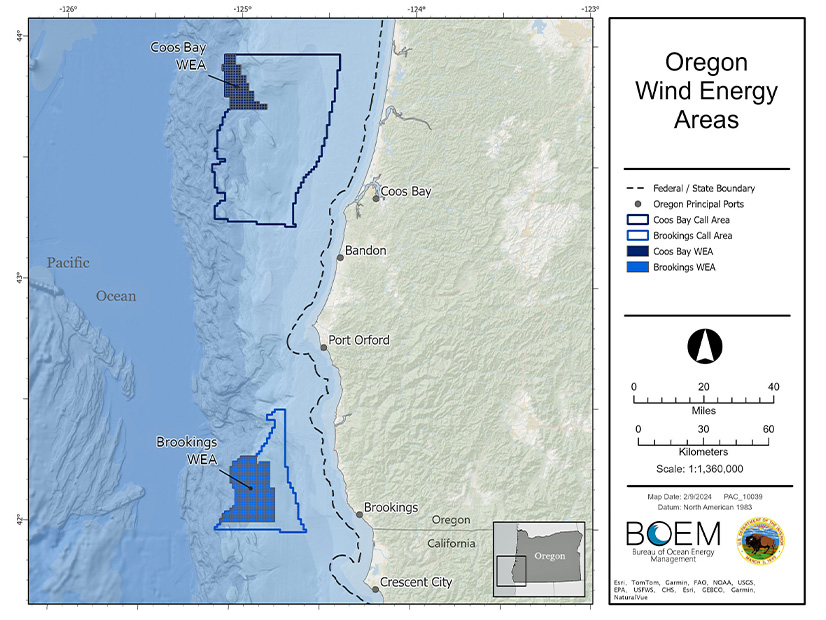 Federal regulators have finalized two Oregon wind energy areas they hope someday will host floating wind turbines with a combined capacity of up to 2.4 GW.