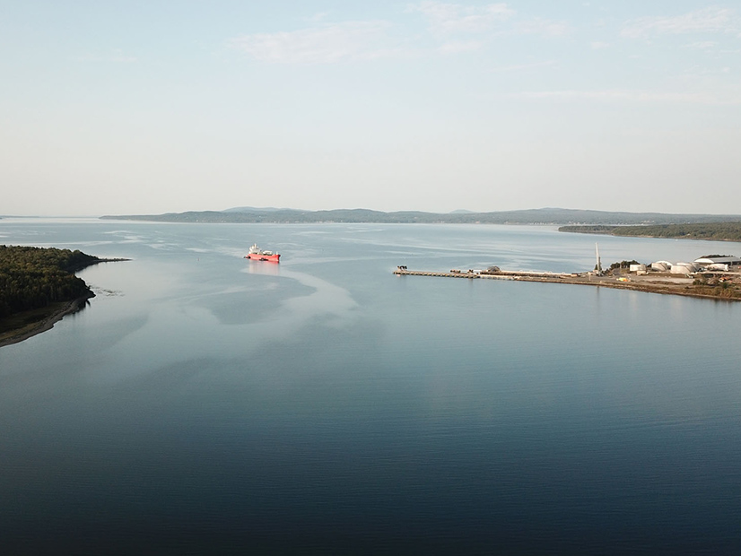 An aerial view of Penobscot Bay in Searsport, Maine, shows Sears Island on the left and an Irving petroleum terminal to the right. | Friends of Sears Island