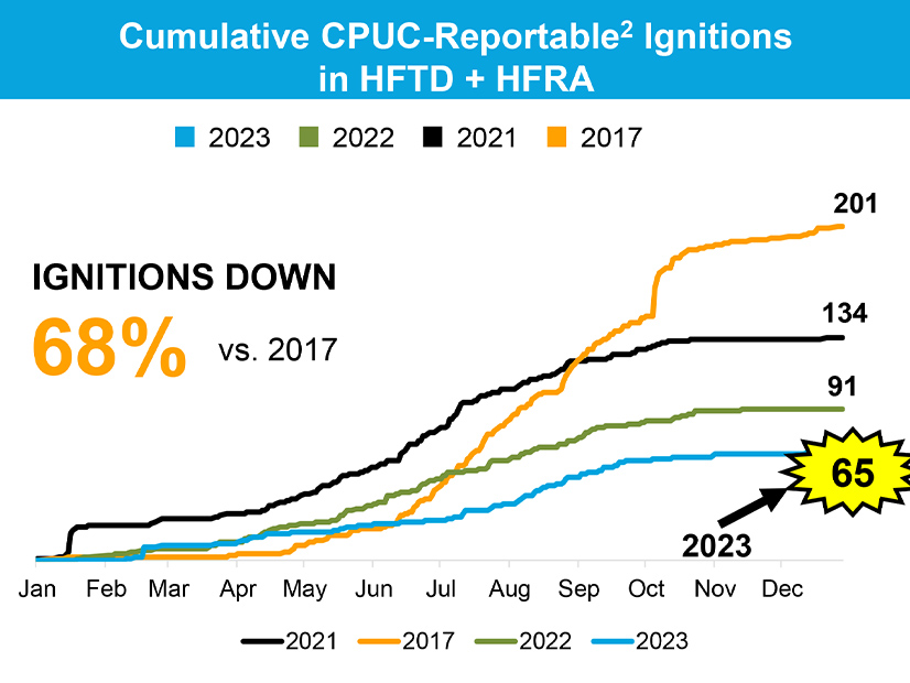 Since 2017, PG&E has seen a steady decline in reportable ignitions from its equipment in high fire threat districts (HFTDs) and high fire risk areas (HFRAs) within its service territory. | Pacific Gas and Electric