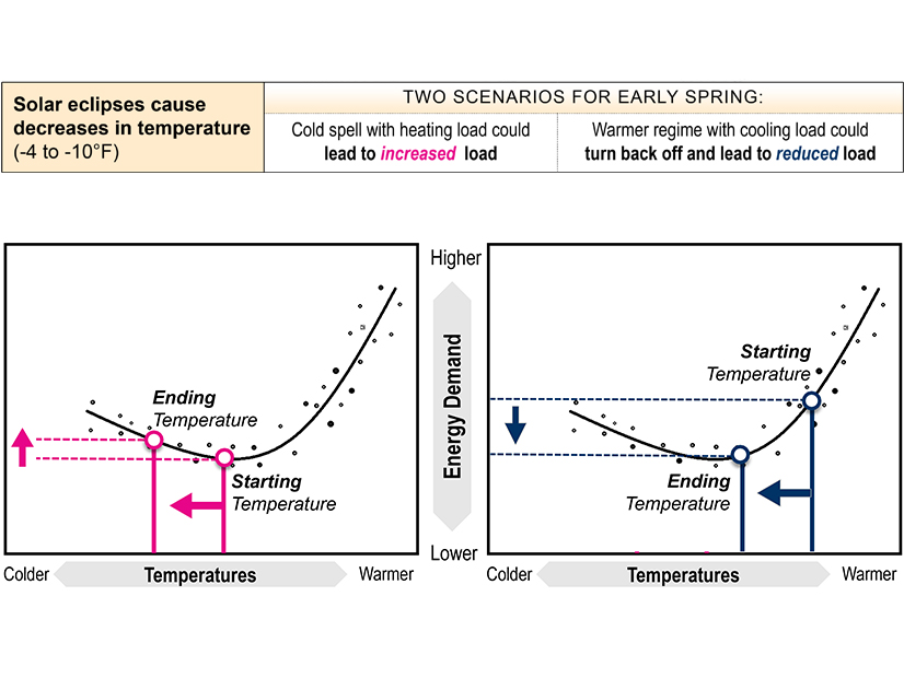 A PJM graphic shows the possible impact to load should the solar eclipse expected on April 8 cause a decrease in temperatures. | PJM