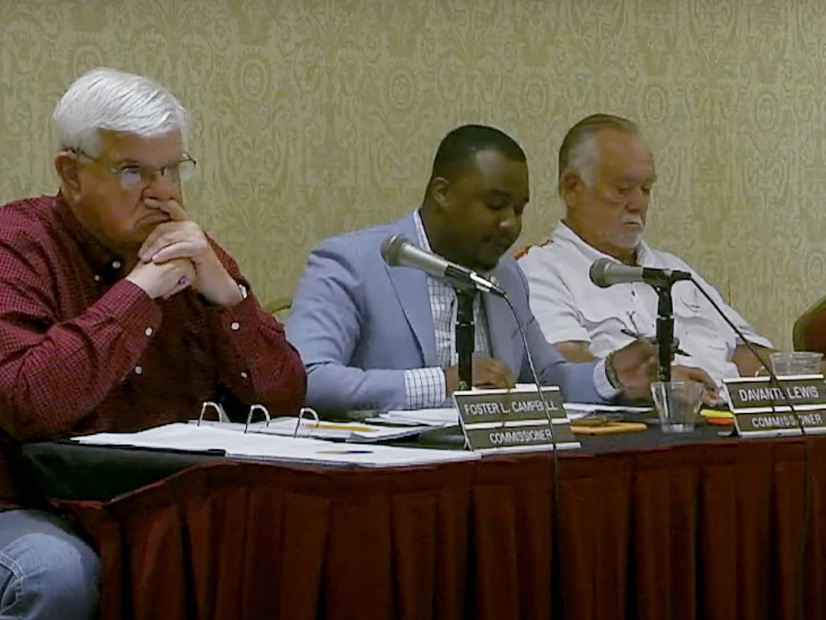 Commissioner Davante Lewis (center) speaks against Entergy's grid resilience plan at an April 19 meeting. | Louisiana Public Service Commission
