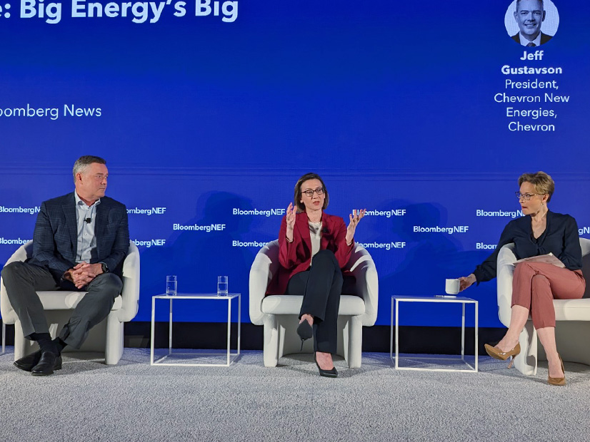 Fossil fuel executives Jeff Gustavson of Chevron (left) and Anna Mascolo of Shell (center) lay out their vision of the role of "low-carbon" technologies in the energy transition, with moderator Alix Steel of BNEF. | © RTO Insider LLC