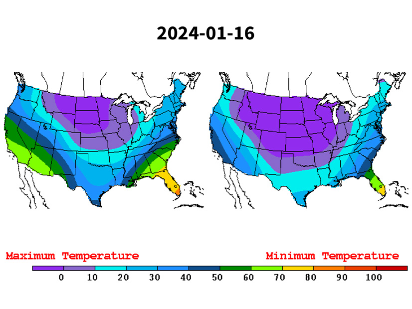 Cold temperatures during the Arctic storms reached their greatest extent on Jan. 16, when large parts of the country never got above freezing. | NOAA