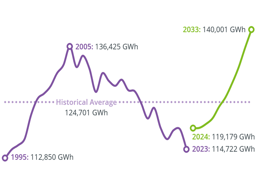 ISO-NE is predicting that New England’s peak load will increase by about 10%, and electricity consumption by 17%, by 2033, according to its 2024 Capacity, Energy, Loads and Transmission report.