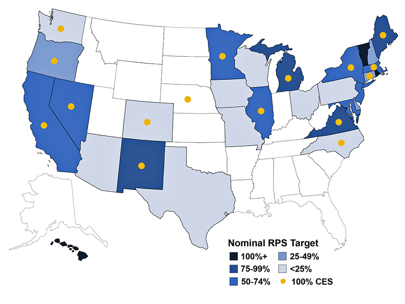 A map shows the states that have enacted renewables portfolio standards or clean electricity standards. | Lawrence Berkeley National Laboratory