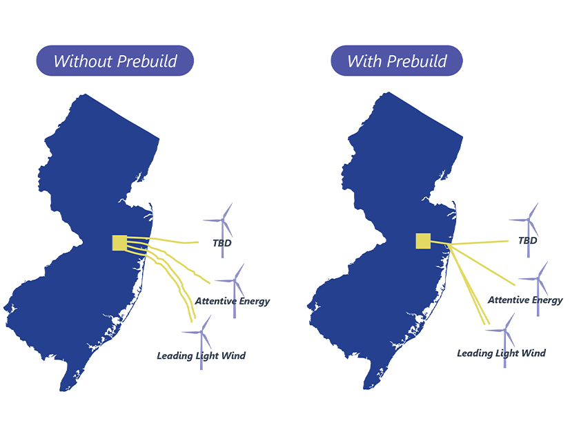 Prebuilt infrastructure will allow four different OSW projects to connect to the grid at a single point (right), rather than needing four separate lines with four different onshore connection points (left). | New Jersey Board of Public Utilities