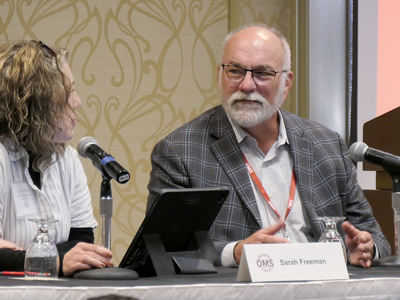 Indiana Utility Regulatory Commissioner Sarah Freeman (left) listens to MISO President and COO Clair Moeller at the Oct. 24 OMS annual meeting. | © RTO Insider LLC