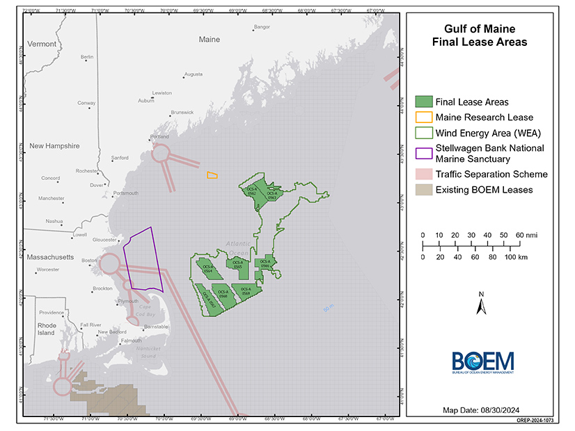 The first-ever offshore wind lease auction for the Gulf of Maine resulted in the sale of four offshore lease areas to two developers, bringing in a total of about $21.9 million.