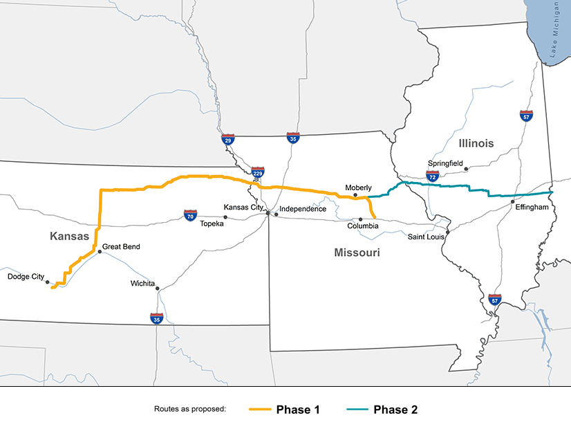 LPO's conditional loan of $4.9 billion will be used to help finance Phase 1 (in yellow) of the Grain Belt Express, a 2,500-MW interregional transmission line running approximately 578 miles from Ford County, Kansas, to Callaway County, Missouri. | Invenergy