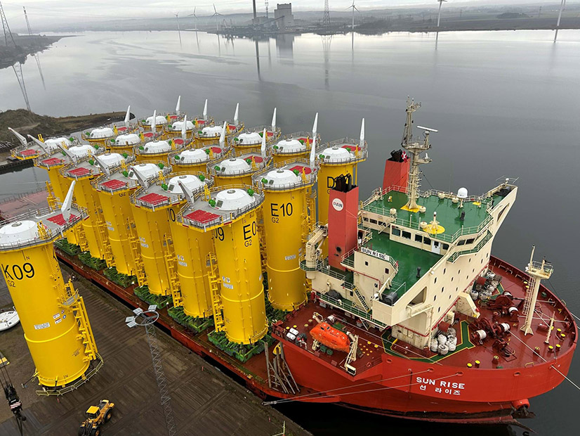 The MS Sunrise prepares to depart Aalborg, Denmark, in November loaded with 18 transition pieces built by CS WIND Offshore for the Coastal Virginia Offshore Wind project. | CS WIND Offshore