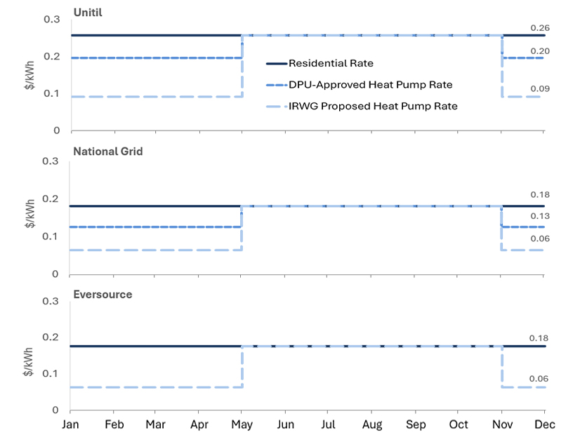 Cost comparison of the standard residential rates, the DPU-approved heat pump rates, and the working group's proposed heat pump rates | Massachusetts Interagency Rates Working Group