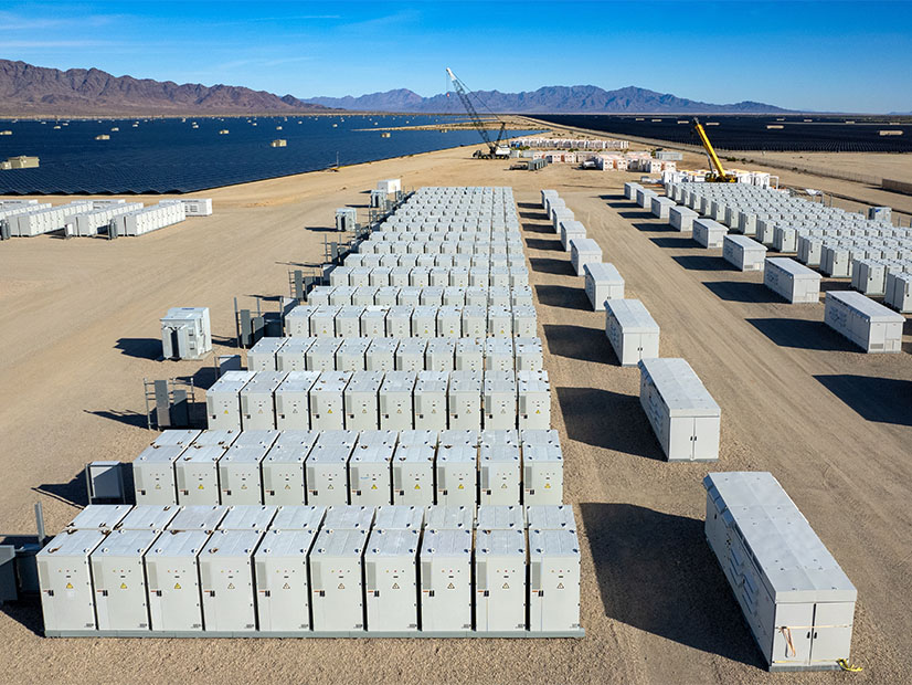 Rows of battery energy storage units are shown at the Desert Sunlight Solar Farm in Desert Center, Calif. | Shutterstock